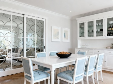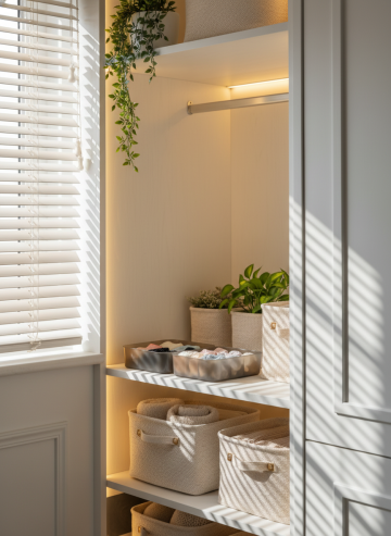 现代美式简约风格的多功能储物空间(通常是玄关或走廊),整体设计干净明亮,实用性与颜值兼备:露出白色平坦天花板, 柜体布局:两侧是通顶白色储物柜,左侧下方带长凳 + 抽屉(方便换鞋 + 收纳),右侧则是抽屉 + 开放格组合,兼顾封闭收纳与展示功能; 细节搭配:墙面做了白色护墙板(增加层次感),地面是浅原木色纹理瓷砖,搭配浅米色长绒地毯,中和冷感; 软装点缀:窗边放了绿植,开放格摆了装饰画、花艺,加上金属拉手 让空间更精致。