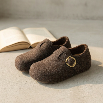 一双勃肯鞋自然摆放,略呈八字形 背景:浅木质纹理桌面,边缘放置: 一本摊开的精装书(露出书页) 一支黄铜书签 一杯热气咖啡(低调入镜) 底部居中:“静默相伴的日常质感”