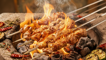浓郁色彩的油画风格描绘热闹的烧烤夜市场景,前景是炭火上滋滋作响的烤肉串,肉质鲜嫩多汁,表面撒有香料,火焰跳跃舔舐着肉串,升腾的烟雾带着金色光晕,周围摆放着装有不同酱料和配菜的小碗,背景是虚化的暖黄色灯光和人影,整体画面充满烟火气与温暖氛围,笔触厚重富有质感,光影对比强烈,色彩饱和度高,强调食物的诱人光泽与夜市的热闹氛围。