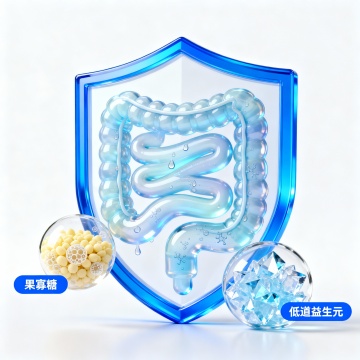 极简高级海报风格,整体以清透浅蓝色为主色调,背景干净纯净。中央一个晶莹剔透的发光盾牌,盾牌内部不是具象肠道,而是微观的“肠道黏膜壁”概念,以蓝色半透明层叠曲面、柔和的微观纹理和光滑起伏的结构表现,呈现出细腻、流动、健康的质感。黏膜表面分布着晶莹剔透的益生菌颗粒,犹如微型蓝色光点或半透明小球,散发柔和光晕,象征益生菌活跃定植。盾牌外环绕发光的蓝色能量光圈,形成保护屏障,隔绝外界干扰。整体画面构图简洁留白,色彩纯净清新,光影柔和,传递“全面呵护肠道健康”的主题,兼具医学感、科技感与高级美感。