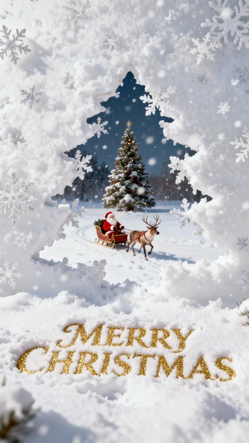 梦幻雪境中的3D浮雕圣诞树,重拟物风格呈现体积感,彩灯光影交织,营造温馨节日氛围。