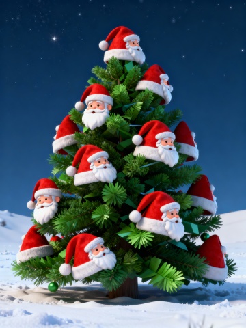软3D风圣诞树,点缀拟人化圣诞老人头像,卡通感十足,喜庆氛围浓郁,塑料质感增添趣味,夜空星辉映衬节日温馨。