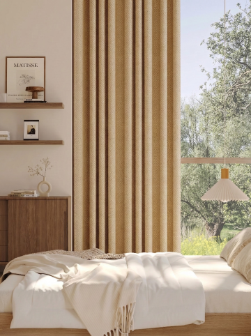 极简风格卧室室内设计,以浅米色墙面为背景,搭配原木色实木床架,铺着浅灰色亚麻质感床单,床头摆放两个浅米色方形靠枕和两个浅灰色长条形枕,床尾随意搭着一条米白色针织毯。床的左侧是原木色床头柜,上面放置一个白色陶瓷小花瓶,插着几根干枝,旁边有一个白色小茶杯和托盘。床头柜上方墙面挂着一幅极简风格装饰画,画框为原木色,画面是三束黑色线条勾勒的麦穗图案。床的右侧是一盏白色金属落地灯,灯罩为米白色布艺材质。床前浅色木地板上铺设一块米白色长方形棉麻地毯,地毯上放着一个圆形编织篮,篮子里有一本翻开的书。整体色调以米色、浅灰、原木色为主,光线柔和,营造出宁静、舒适、简洁的氛围,空间布局对称平衡,线条干净利落,无多余装饰,体现极致的简约美学。
