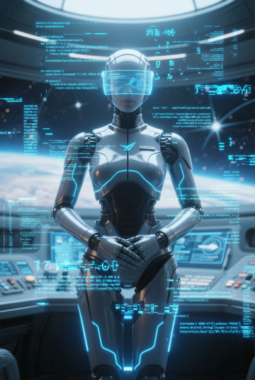 超写实3D渲染的科技感机器人,金属质感的黑色头部与银色躯干,蓝色发光眼睛与内部机械结构细节清晰可见,头部微微侧转,背景是深邃的蓝色渐变,布满流动的霓虹蓝色数据流线条与橙色、红色光点,左侧有巨大醒目的白色“AI”字样,整体光影效果强烈,高光与阴影对比鲜明,营造出未来感与科技氛围,画面聚焦机器人上半身,构图紧凑,充满视觉冲击力。