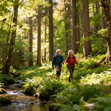 一对头发花白的老年夫妇在不同的户外场景中温馨互动的画面,背景可以是公园的林荫道、湖边的长椅、山间的小径或宁静的花园等。两位老人面带温暖灿烂的笑容,神情愉悦自然,老爷爷穿着浅灰色的长袖针织衫,老奶奶穿着米色的高领内搭和同色系的开衫马甲,老奶奶手中捧着一个白色的茶杯,老爷爷的手臂亲切地搭在老奶奶的肩上,两人姿态亲密和谐。画面整体采用写实风格,光线明亮柔和,以自然光为主,呈现出温暖的色调,绿色的植物背景郁郁葱葱,充满生机,营造出宁静、幸福、安逸的氛围,整体构图清晰,主体突出,细节丰富,具有生活气息和情感温度。