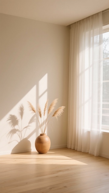 极简主义风格的现代客厅背景,整体以米白色、原木色和浅灰色为主色调,柔和的自然光从左侧大窗户斜射入室内,在墙面和地板上形成清晰而温暖的光影效果,光线明亮且均匀,营造出宁静、舒适、通透的氛围。画面中央是一张米白色布艺三人沙发,搭配同色系的靠垫,沙发腿部为浅色木质,沙发上随意搭着一条浅色毯子。沙发前方是一张浅木色长方形茶几,茶几上摆放着简约的白色陶瓷花瓶和几本书籍。沙发左侧靠近窗户处有一盆茂盛的绿色植物,栽种在白色高花盆中。沙发右侧是一个浅色木质书架,书架上摆放着少量书籍、装饰品和一个装饰画框。地面铺设浅色木地板,沙发前铺有一块浅灰色地毯。整个场景构图简洁大方,线条流畅,材质表现细腻(布艺的柔软、木质的温润、陶瓷的光滑),空间感强,具有高度的现代设计感和舒适的居家氛围。