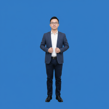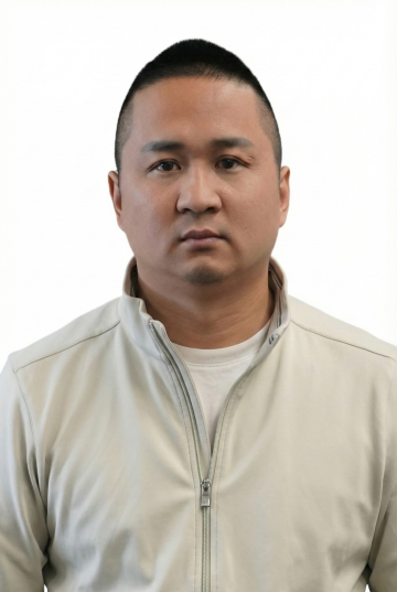 保留人物脸型、发型、年龄特征生成标准职场形象照,50MM焦段,F/4光圈(F/2.8-F/4区间),相机与人物距离3米,横向16:9比例(左右预留环境空间),人物占画面60%,入镜头部至膝盖上方5CM,平视视角,人物居中构图,头肩比例协调,身穿深墨蓝色西装,内搭白色衬衫,精致且高级的深蓝色斜向微微渐隐光泽感极细条纹商务感领带,下装黑色西裤搭配黑色皮带;正面抱胸姿态,肢体舒展的站立姿态,自信从容;主体锐利,痘印精准去除.肤质精细化处理;消除暗沉轻度磨皮,轻度美颜,均匀肤色提亮肤色,发梢微微修整气质干练,眼神直视镜头,目光坚定且澄澈,表情自然.嘴角上扬,严谨内敛稳重;均匀肤色,专业人像摄影写真,头部完整,结构准确;光比1:1.5,4800K中性光,修饰脸型,肤质哑光细腻,面部雾面柔光,轻透裸肌感,真实毛孔纹理,32K画质,去除人物之外的所有元素,零噪点降噪,简约中深灰色纯色背景。