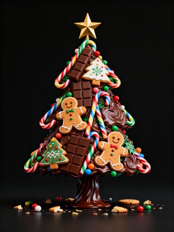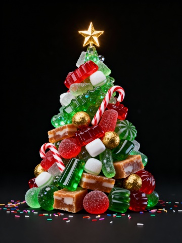 3D重拟物风格的糖果圣诞树,融合波普艺术色彩与拼贴手法,满载喜庆感、甜美感与趣味感,节日氛围浓郁。