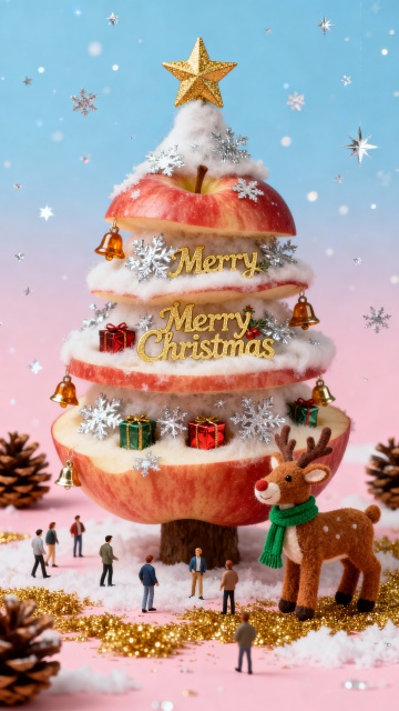 微缩艺术风圣诞树由苹果切片堆叠而成,融合3D立体与重拟物设计,点缀毛发生长感绒雪与拼贴风装饰,营造梦幻可爱喜庆的节日氛围。