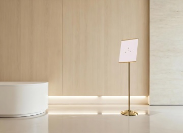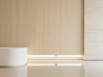 极简主义风格直播间背景,整体采用柔和的米白色与浅木色为主色调,营造出温馨、高级且宁静的氛围。墙面设计有流畅的弧形拱门造型,内嵌暖黄色灯带勾勒轮廓,底部铺设白色鹅卵石装饰带。地面为浅色木地板,呈人字形拼接图案,光感柔和自然。空间内有简约的浅木色圆形装饰镜挂于墙面,搭配白色弧形矮柜,矮柜底部为木质支撑腿。顶部安装嵌入式筒灯和轨道射灯,提供均匀且明亮的无阴影照明。光线呈现柔和的漫反射效果,明暗对比适中,整体构图注重对称与平衡,具有现代简约的设计感和舒适的视觉体验,适合作为展示或直播的纯净背景空间。