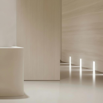极简主义室内场景,左侧保留原木色竖条纹木格栅墙元素,右侧为米白色平滑墙面,中央悬挂一个白色球形吊灯,下方是圆形白色桌面、浅色木质交叉腿设计的桌子,地面铺设白色大理石瓷砖,右下角有一块浅灰色地毯。背景改为柔和渐变的浅米色至淡灰色过渡,光影调整为从右上角窗户斜射而入的温暖午后阳光,在地面形成清晰的长条形光斑,墙面呈现出由明至暗的自然光影渐变,整体保持3D渲染的细腻质感、干净利落的线条和简约高级的现代设计风格。