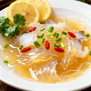 中式酸菜鱼,实景感十足,清新爽口,光影柔和,质感细腻,重拟物风呈现,搭配柠檬与辣椒,视觉与味觉双重享受。