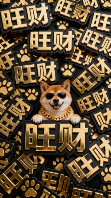 手机9:16壁纸,3D重拟物风格,鎏金浮雕“旺财”字样堆叠,金属质感十足,柴犬戴墨镜配金链,奢华喜庆,潮流感爆棚,尽显狗哥威武霸气。