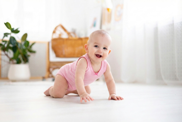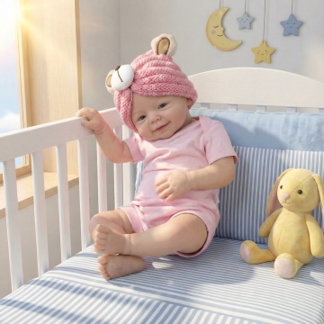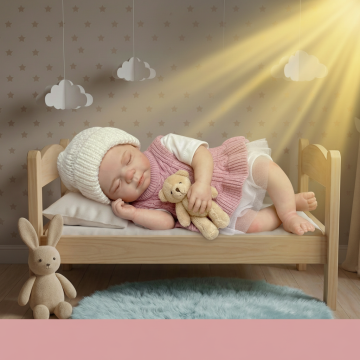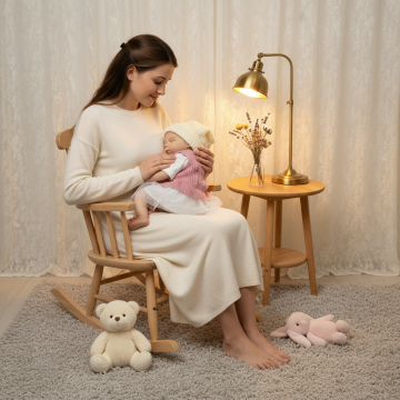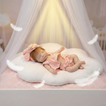 方案三:飘窗小憩场景:娃娃躺飘窗软垫,背景是绿植与绘本,浅灰地毯铺陈,低饱和色调显家居质感