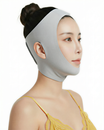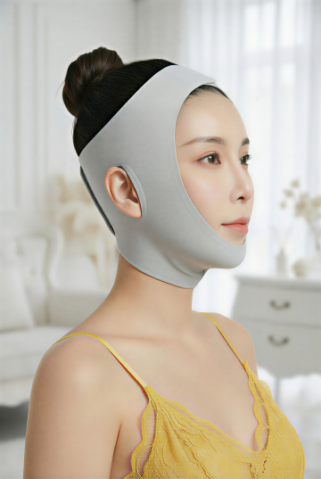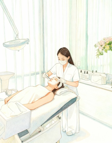 侧脸向上扬起的女性,双眼轻闭,深棕色头发优雅挽成低发髻,面部覆盖着由发光线条构成的网格,网格节点处有闪烁的白色光点,肌肤呈现出极致细腻、光滑、通透的质感,整体画面采用纯净的白色背景,光线柔和均匀地洒在人物轮廓上,营造出科技感与自然美的完美融合,突出皮肤的健康光泽与精致纹理,氛围宁静、高端且富有未来感。