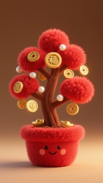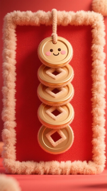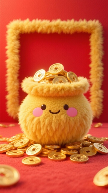 主体:超大号短绒红包(烫金福字 + 立体绒球流苏,填棉饱满),作为核心视觉焦点;点缀:铺着米白短绒的迷你毛绒案几(仅案面毛绒,不夸张),周围散落 3-5 颗迷你毛绒元宝、2 个小毛绒祥云挂件;甜品:1 个迷你毛绒仿真桂花酒酿圆子(小毛绒球 + 细绒糖霜),摆红包旁;场景:背景是局部毛绒装饰的中式窗棂(仅边框裹绒),暖黄主光直射红包,勾勒绒面肌理,点缀光柔和照亮小装饰,整体聚焦主体