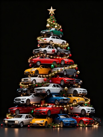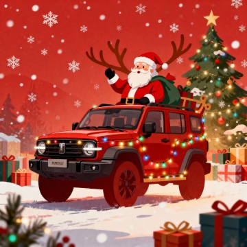 喜庆感十足的插画风圣诞场景,拟人化圣诞老人驾乘装饰彩灯的红色越野车,融合波普艺术与水彩质感,营造温馨节日氛围。