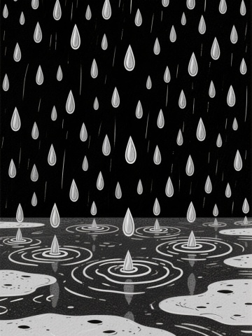 极简主义风格的黑白插画,画面中大量银色的雨滴从黑色的天空中垂直落下,雨滴大小不一,错落有致,下方是被雨水打湿的地面,地面上有不规则的水波纹和涟漪,整体画面简洁而富有韵律感,营造出一种宁静而神秘的氛围,雨滴和水波纹的线条流畅而细腻,黑白对比强烈,具有很强的视觉冲击力。