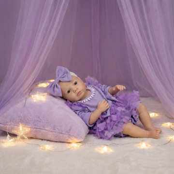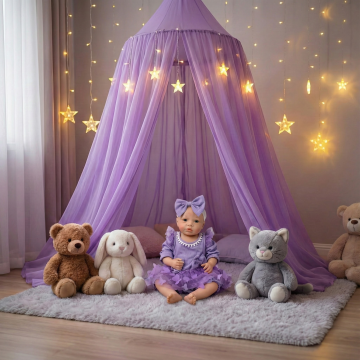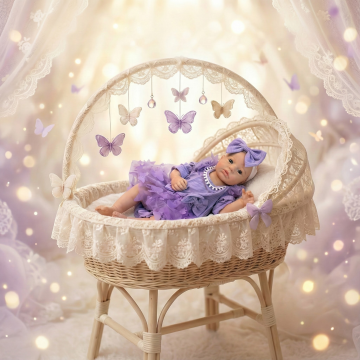 方案二:星光地毯场景:玩偶趴于毛绒云朵地毯,周围散落发光星星玩具,暖白主调+浅蓝点缀,强化互动性