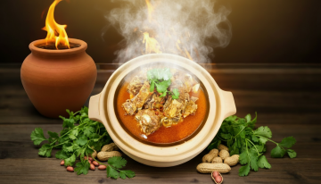 高质感美食摄影,暖色调灯光营造温馨氛围,深色木质餐桌上铺着绿色芭蕉叶,中央摆放黑色陶锅盛装的红烧大块肉,表面点缀白色菊花与绿色香菜,周围环绕多道菜肴:左侧两碗白米饭撒有葱花,前方白色瓷盘盛有菠萝虾仁沙拉,右侧银色金属碗装彩色蔬菜丁,背景有棕色陶罐与插着橙色花朵的白色瓷瓶,整体构图饱满,食物细节清晰,光影层次丰富,营造出丰盛诱人的餐饮场景。