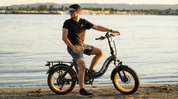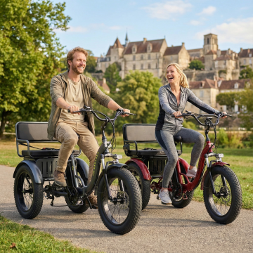 构图:人物位于画面中央偏右,自行车占据画面2/3空间,背景绿植形成自然边框,整体画面充满活力与都市休闲感。