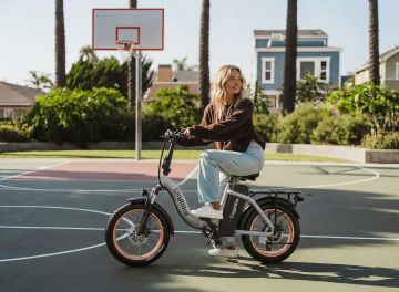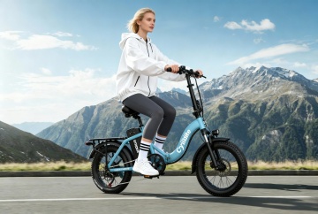 主体场景:一名金发欧洲年轻女性骑着电动自行车,她穿着浅蓝色宽松外套(袖口微敞)、白色内搭T恤和黑色修身长裤,脚穿黑色运动鞋,身体微微前倾,面带自然微笑,目光看向右侧前方,姿态轻松惬意。