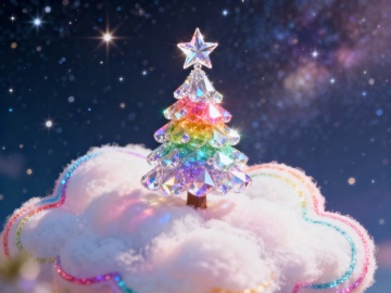 梦幻感云朵构成的圣诞树,光影交织,体积饱满,插画风与超现实主义融合,水彩般的渐变色彩,粒子飞鸟环绕,营造虚拟自然奇景。