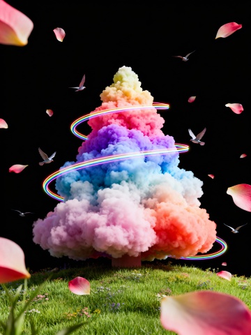 梦幻云彩圣诞树,彩虹环绕,花瓣纷飞,3D超现实风格,粒子与气笔融合,营造唯美元素与浪漫氛围。
