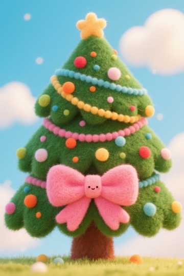 一只可爱的圣诞树,时尚,第一层彩色波点蝴蝶结,大大的粉红蝴蝶结,很可爱,高饱和度,可爱嘟嘟,毛绒绒且柔软,第二层撞色系,羊毛毡风格,非常可爱,,卡哇伊,画面简约,高饱和度,轻松气氛,丝滑的画质,中景视角,标准镜头,简约风格,32k高清图,萌态十足,蓝天白云背景,精妙无双