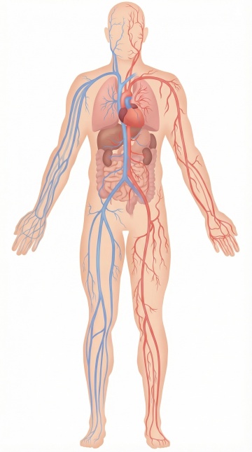 手绘风格的人体解剖示意图,以白色为背景,采用清晰的线条勾勒出完整的人体骨骼结构和主要内脏器官,骨骼呈淡米黄色,大脑为浅蓝色,肺部为淡紫色,心脏为红色,肝脏为红褐色,胃为棕色,肠道为灰色,肾脏为粉红色,膀胱为黄色,所有器官和骨骼均以简洁、平面的手绘风格呈现,无立体阴影,线条流畅且边缘平滑,整体构图为正面站立人体,各器官位置准确且清晰可见,具有科普教育性质的医疗插画风格。
