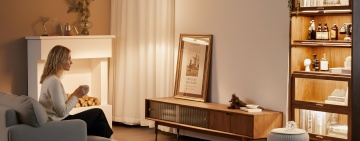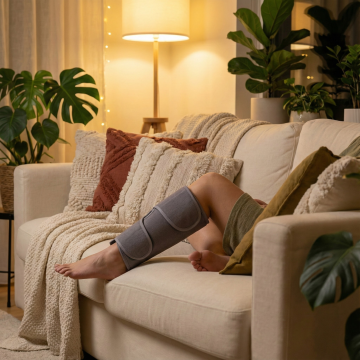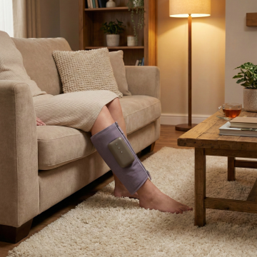 生成这个小腿按摩器的模特图,模特在温馨的房间里,坐在柔软的沙发上。生成4张,产品不能发生改变。