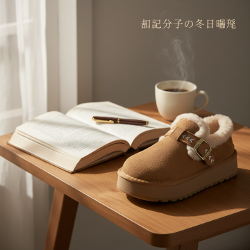 布局: 场景图。一只鞋子正面摆放,另一只微微翻折,巧妙露出内部温暖的羊羔绒。鞋子置于铺有厚羊绒毯的旧椅子上,旁边有一杯热饮和一本书。图片要真实 文案: 底部居中,细字体,“外,从容;内,温润”。 目的: 一眼展示“内外材质不同”的核心卖点,并奠定温暖知性的基调。