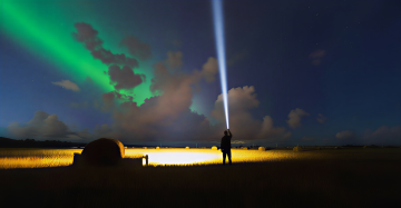 帮我生成在这张图中模特的右手边站立着另一个男士,手里握着手电筒朝画面右边照射,光束呈直线向右边垂直延伸,照亮远处的树木和草丛
