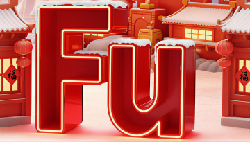 中式庭院融梦幻与温馨,软3D毛发生长风呈现可爱卡通感,雪中红梅与暖灯交织,营造冬日节日氛围。
