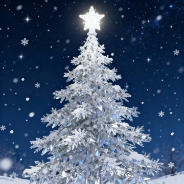 冰晶质感的圣诞树在梦幻蓝光中静谧矗立,玻璃风3D设计融合虚拟自然,光影流转间展现清透感与冬日浪漫。