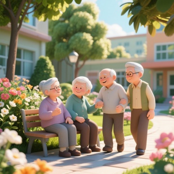 一对头发花白的老年夫妇在不同的户外场景中温馨互动的画面,背景可以是公园的林荫道、湖边的长椅、山间的小径或宁静的花园等。两位老人面带温暖灿烂的笑容,神情愉悦自然,老爷爷穿着浅灰色的长袖针织衫,老奶奶穿着米色的高领内搭和同色系的开衫马甲,老奶奶手中捧着一个白色的茶杯,老爷爷的手臂亲切地搭在老奶奶的肩上,两人姿态亲密和谐。画面整体采用写实风格,光线明亮柔和,以自然光为主,呈现出温暖的色调,绿色的植物背景郁郁葱葱,充满生机,营造出宁静、幸福、安逸的氛围,整体构图清晰,主体突出,细节丰富,具有生活气息和情感温度。