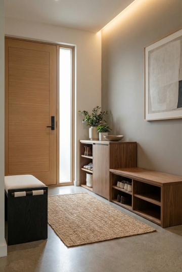 现代极简主义卧室,深棕色实木床头板与床头柜,纹理清晰自然,搭配浅米色与深灰色床品,柔软的白色枕头与棕色靠垫,右侧黑色墙面带有嵌入式暖黄色灯带,床头柜上摆放着带有黄色花朵的花瓶,整体色调沉稳温暖,柔和的侧光营造出宁静舒适的氛围,光影层次分明,材质质感细腻真实,空间布局简洁有序,具有高级的现代家居设计感。