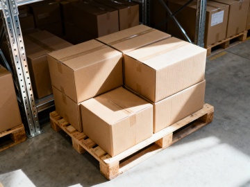 超写实主义摄影风格,高清晰度,明亮自然光从顶部天窗和两侧高处窗户均匀洒落,光线柔和无强烈阴影,整体色调以工业灰、金属银、纸箱棕黄为主,辅以局部亮色点缀。纵深构图,中央是洁净光滑的浅灰色环氧地坪通道,两侧高耸的金属仓储货架整齐排列至画面尽头,货架上堆满不同尺寸的棕色纸箱,部分纸箱贴有蓝色或黄色胶带标签。不同样式的现代化仓库内部场景,保留金属货架结构和整齐堆叠的纸箱核心元素,可替换为具有不同布局(如U型货架、多层阁楼式货架)、不同仓储设备(如叉车、传送带)或不同货物类型(如塑料托盘、金属容器)的仓库环境,通道尽头可设置不同的墙面设计或仓库门样式,保持空间的通透感和工业仓储的秩序感,画面干净整洁,细节丰富,具有强烈的空间纵深感和真实的材质质感。