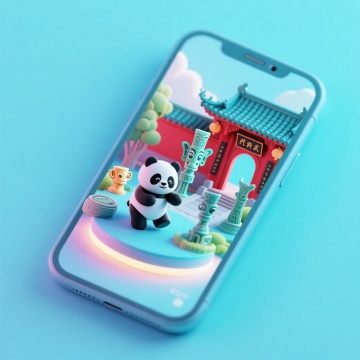 软3D风格的微缩艺术场景,可爱熊猫坐于手机屏幕之上,中式古建筑与青铜面具点缀其间,梦幻蓝调光影营造童话氛围。