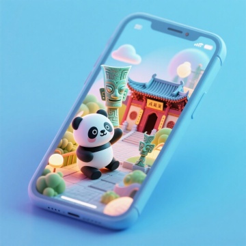 一个手机创意微缩场景,手机平放,侧面对着观众,手机俯视角度,立体的成都景观从屏幕内出来,有熊猫,三星堆,武侯祠,整体色调立体魔幻。青色背景。具有梦幻感,打光营造出柔和氛围强调梦幻和未来感的美学。