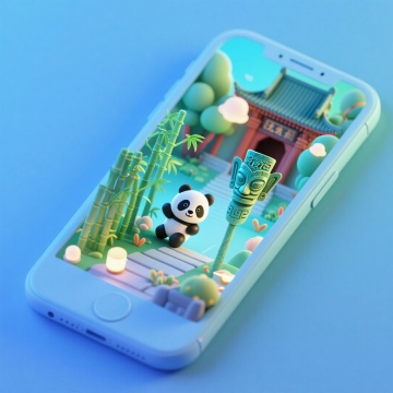 软3D风格手机微缩场景,熊猫与传统建筑萌趣互动,梦幻渐变光效,粘土质感十足,充满童趣与节日氛围。