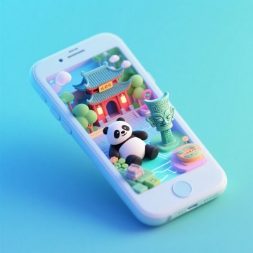 软3D风微缩艺术,熊猫与中式建筑在手机屏中萌趣互动,粘土质感融合卡通元素,展现东方美学与科技的可爱碰撞。