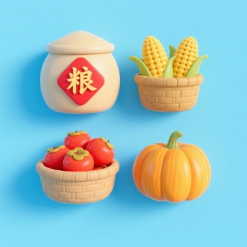 软3D风+粘土质感,可爱卡通化丰收元素,重拟物设计呈现粮仓、玉米、柿子与南瓜,呼应秋收节庆氛围。