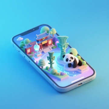 软3D风格的微缩艺术场景,熊猫与传统建筑在手机屏幕上梦幻呈现,融合科技感与卡通感,清新柔和,充满可爱气息。