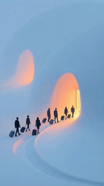 构图不变,图中是一个人拉箱子走,改成一群人拿着箱子走。