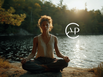 写实风格瑜伽人物摄影,一位女性背部视角,短发,身着灰色短袖上衣与深蓝色紧身瑜伽裤,呈莲花坐姿,双臂向上伸展合十,动作舒展自然。她静坐于铺在平静水面上的浅灰色瑜伽垫上,水面清晰倒映出人物轮廓。背景改为秋日景象,天空呈现柔和的淡蓝色与白色云朵交织,水面泛着微光,周围点缀着飘落的金黄枫叶,岸边可见些许橙红色的秋树,整体色调温暖而宁静,光影柔和,营造出平和、专注、与自然融合的秋日瑜伽氛围,画面构图简洁,主体突出,视觉层次分明,能在短时间内传达出宁静致远的核心意境。