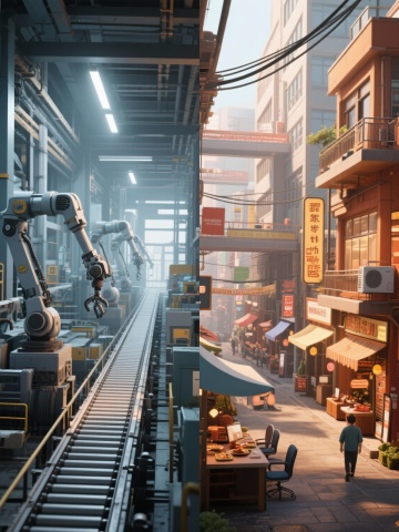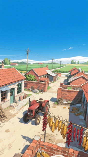 水墨风与工笔风融合,展现古典中式街景,质朴市井生活跃然纸上,夕阳映照古城门,尽显复古韵味。