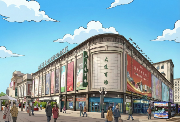 生成一张副食街的二次元漫画图片,在副食街的入口处需要一个牌坊,牌坊上写“大商副食街”