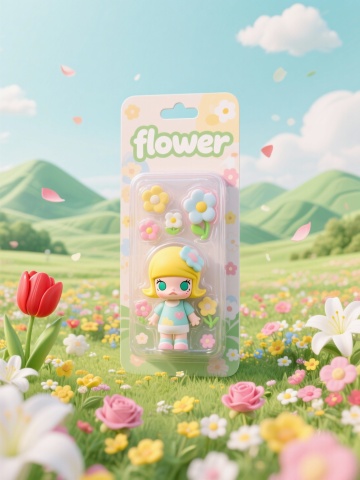 清新3D卡通拟人风,波普艺术花朵点缀,营造梦幻花海节日氛围。