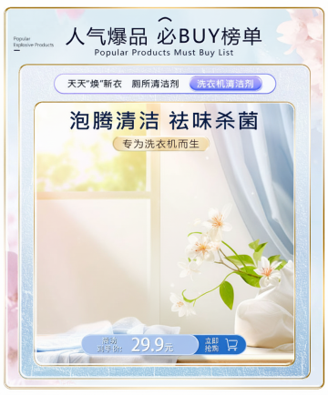 清新自然的浴室场景,轻拟物风设计融合粒子水珠效果,营造柔和清爽感,实景质感突出产品舒适体验。